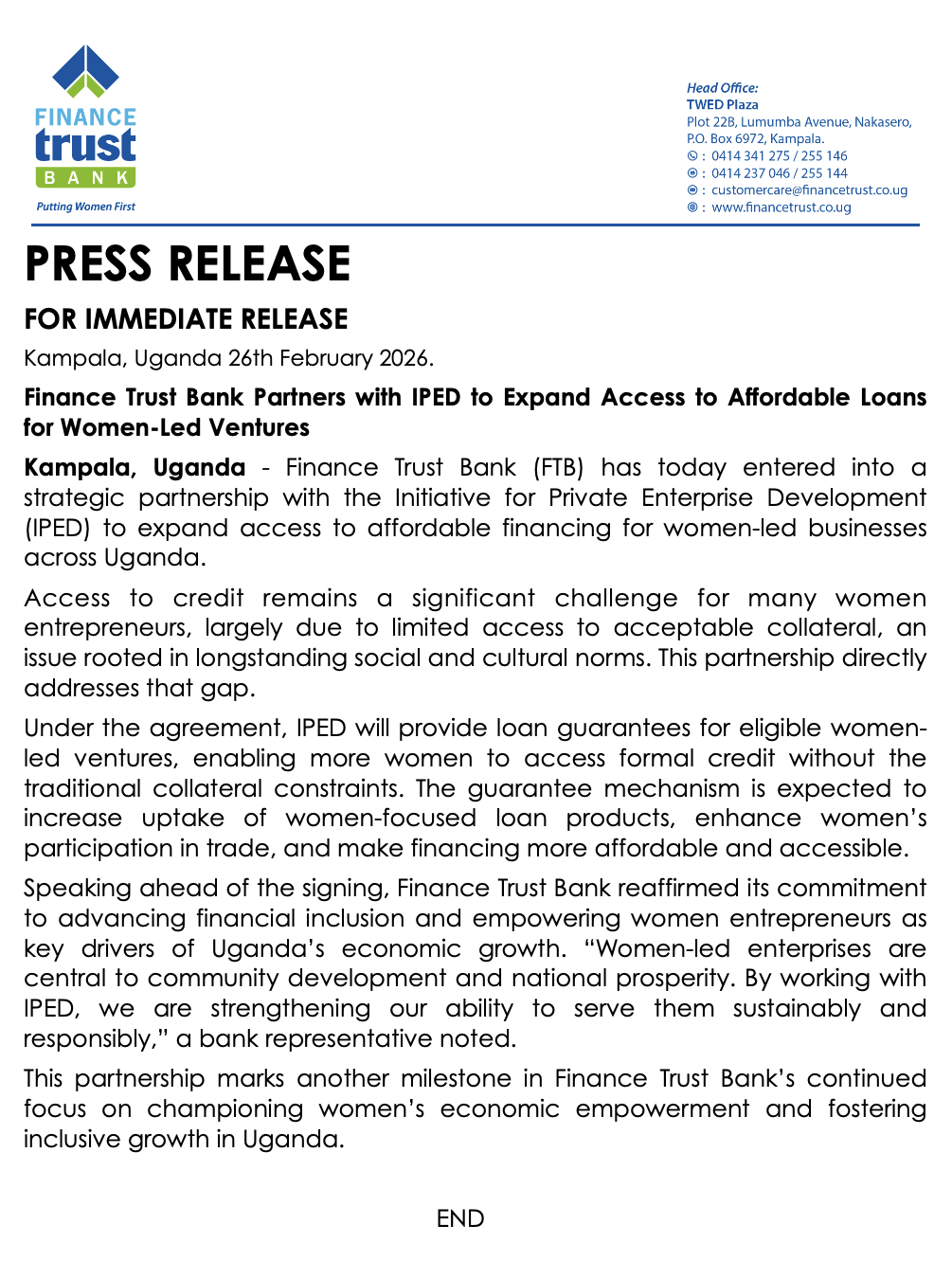 © Finance Trust Bank Uganda, Head Office Plot 22B TWED Plaza Lumumba Avenue, P.O. Box 6972 Kampala, Uganda | Tel: +256 414 341275 / +256 414 255146 |